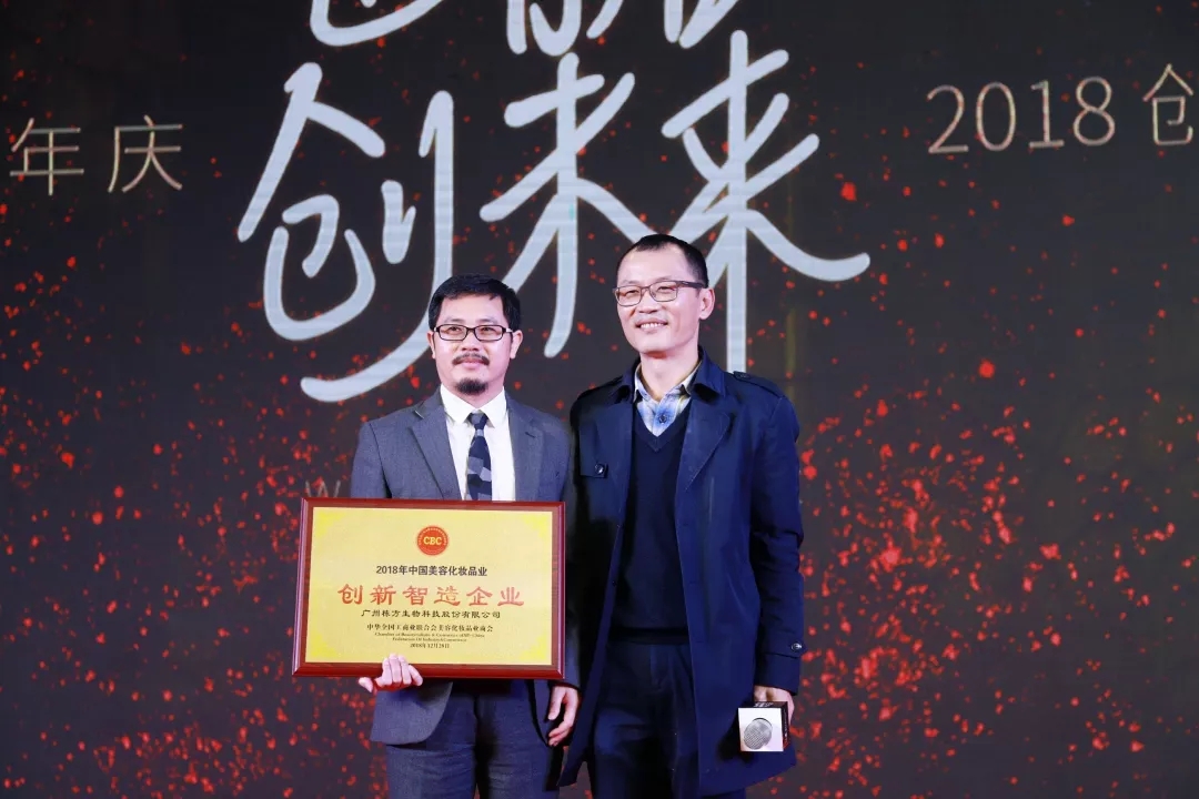 隨后,青島金王總經(jīng)理唐風(fēng)杰先生,中國美妝總經(jīng)理桂紹元先生、中華全國工商聯(lián)合會美容化妝品業(yè)商會蔡永忠副會長先后上臺致辭,對棟方股份集團近幾年的卓著成就給予高度肯定,對行業(yè)發(fā)展發(fā)表了頗有見地的分享。蔡永忠副會長代表中華全國工商聯(lián)合會美容化妝品業(yè)商會給棟方股份集團20周年帶來了一份驚喜的生日禮物,為棟方股份頒發(fā)了“創(chuàng)新智造企業(yè)”大獎,回顧棟方股份2018年的累累碩果,這一榮譽,實至名歸。